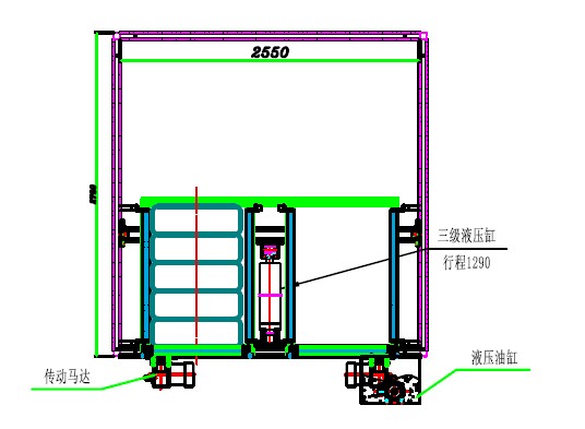 A. 进货:司机把车辆停靠在码头固定位置,车辆限位到达,跟上货平台对接完成。司机把线缆接入上货物流平台航空插座,在车辆控制柜处选择“进料”按钮,2排5列进料滚筒输送线启动,分3批(2*5)把30辆份轮胎输送进车厢底层通道(此时上下层通道重合在一起),当第一批次下层轮胎(2*15辆份)完全进入货车车厢后(最前列轮胎到达指定位置(车头第1列位置)且最后列轮胎完全进入车厢内第15列位置),司机手动启动“上层上升”按钮,液压系统启动,5个同时液压缸升起来,分5段(2*3辆份)的上层吊篮结构升起,底层通道的轮胎跟随吊篮被提升至上层空间位置,下层通道完全腾空,司机再次启动物流平台“上货”按钮,2排5列进料滚筒输送线启动,继续上货下半部分30辆份车辆轮胎,上货完成则选择“停止”档,拉上斜拉门并选择控制柜门上 卷帘门“上升”按钮升起卷帘门,拔掉航空插头电源,开车启程前往主机厂。
